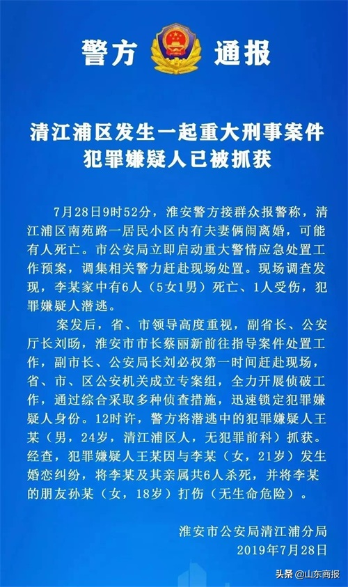 省、市、区公安机关成立专案组,全力开展侦破工作,通过综合采取多种侦查措施,迅速锁定犯罪嫌疑人身份。12时许,警方将潜逃中的犯罪嫌疑人王某(男,24岁,清江浦区人,无犯罪前科)抓获。经查,犯罪嫌疑人王某因与李某(女,21岁)发生婚恋纠纷,将李某及其亲属共6人杀死,并将李某的朋友孙某(女,18岁)打伤(无生命危险)。