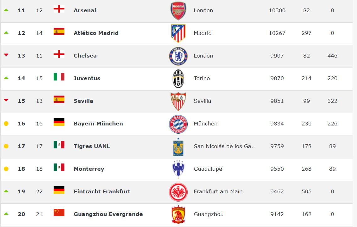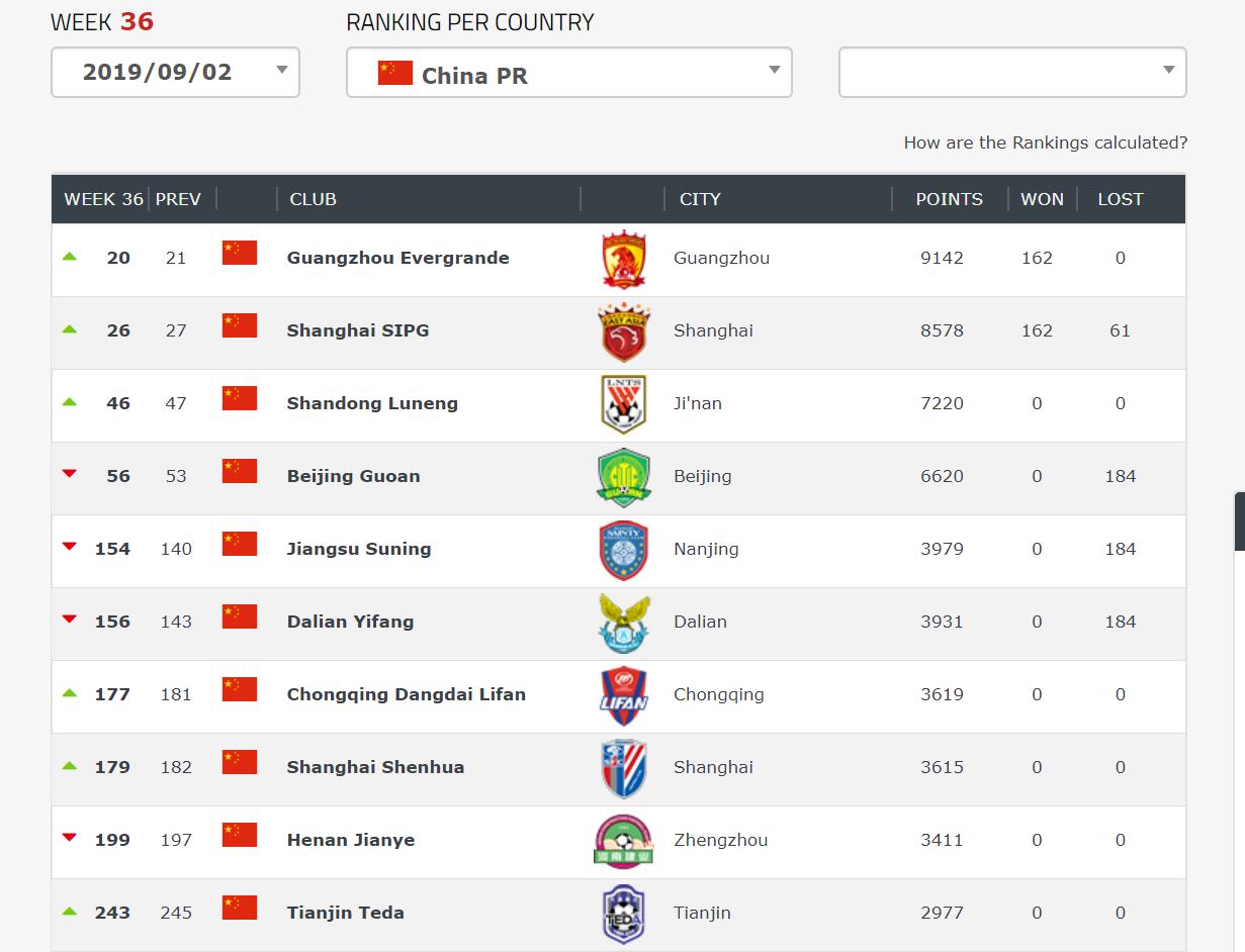 其中,恒大位列第20位,和之前相比提升了一个位次;上海上港第26位,鲁能位居第46位,国安位居56位,苏宁位居154位,大连一方156位,重庆力帆第177位,申花第179位,河南建业第199位,天津泰达第243位。