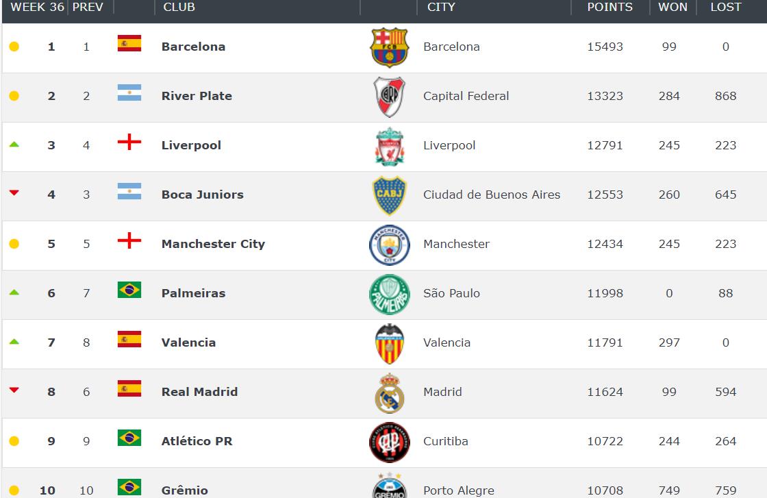 前十俱乐部依次为:巴萨、河床、利物浦、博卡青年、曼城、帕尔梅拉斯、瓦伦西亚、皇马、巴拉纳竞技、格雷米奥。