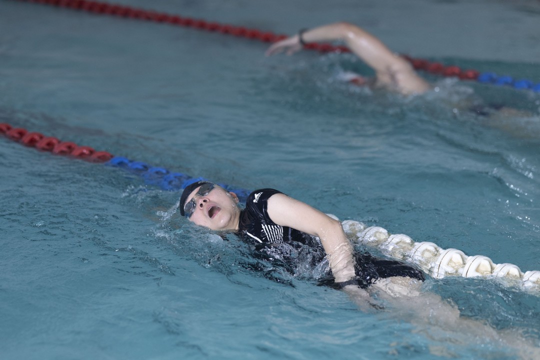 杨晓婷在引导员的指引下下,一步步迈入泳池里,嘴里还欢快地和引导员打趣。下水后,她认真地练起尚不熟练的自由泳,努力克服着视力障碍带来的缺乏方向感。引导员偶尔陪伴在旁,为她掌舵,大部分时间她要自己探索。