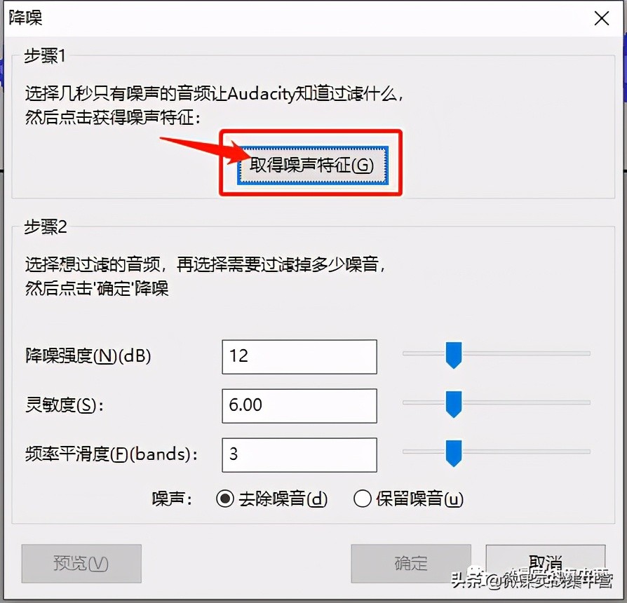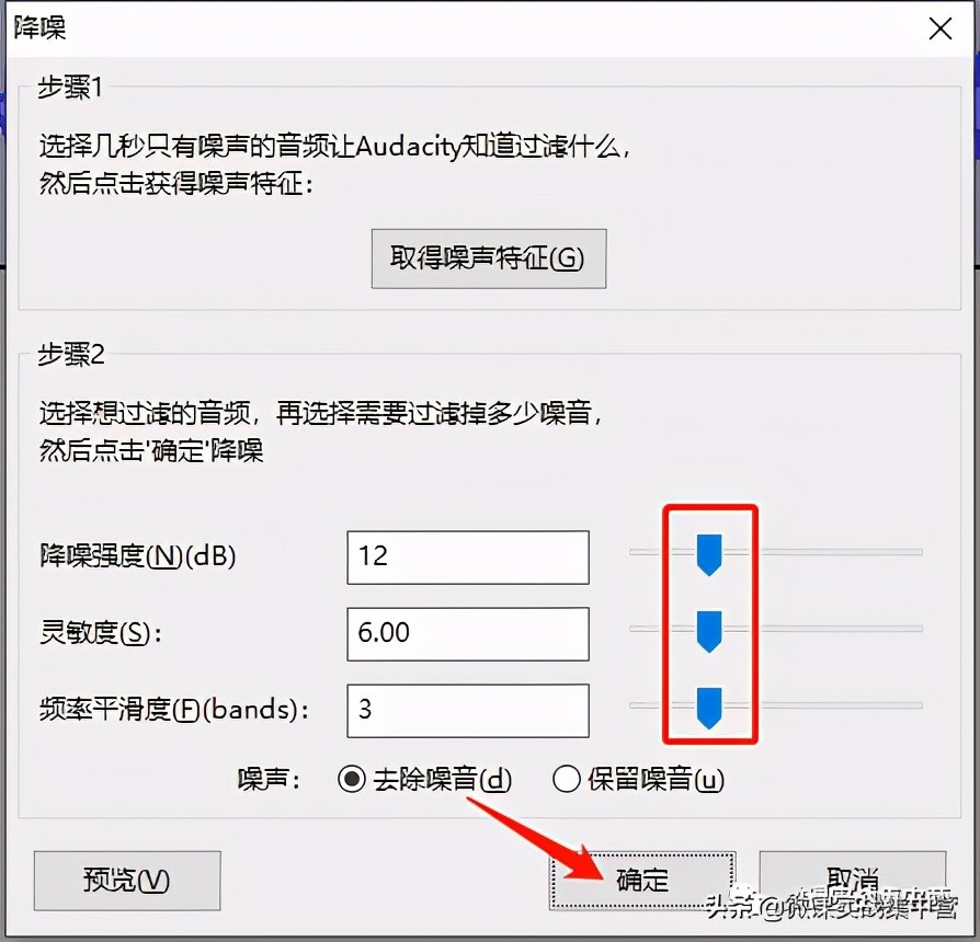 可以点预览听效果,不合适的话再调整下面的降噪强度、灵敏度等。