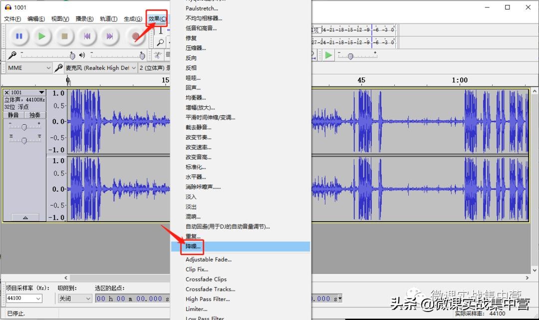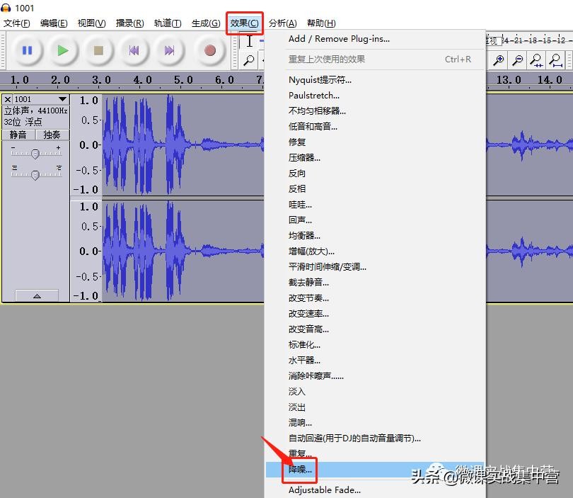 2、Ctrl+a全选所有声音,再进入效果点击降噪。