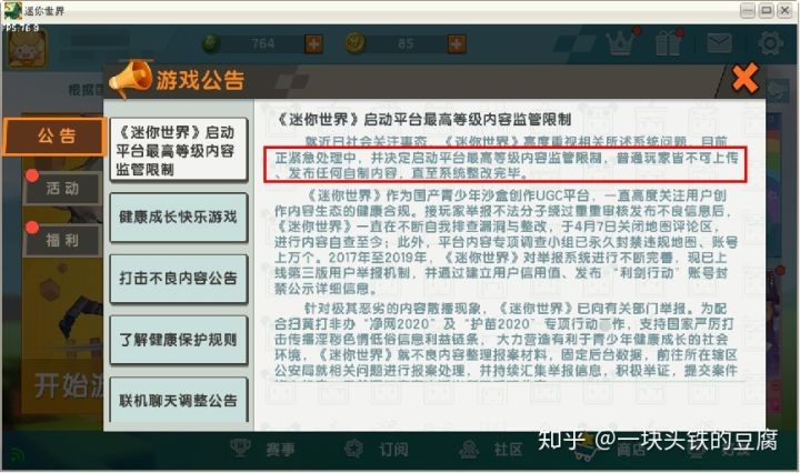 更滑稽的是,根据《迷你世界》目前的整改措施来看,确实是在这么做,先是关了评论区,今天又宣布普通用户不能上传、发布任何内容,逐渐阉割成一个单机游戏。