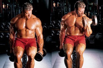 然后弯举哑铃向肩部方向举起,顶点保持顶峰收缩,上举速度慢一些,下放的速度也慢一些。