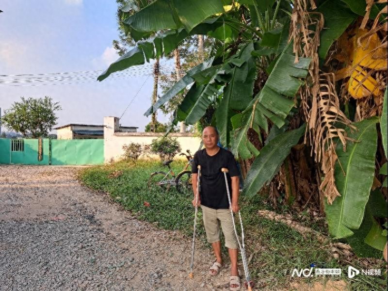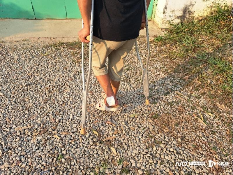 11月2日,今年57岁的陈杰依靠两支金属拐杖,瘸着走向厂区门前的芭蕉树旁,向南都记者还原两个半月前从梯子上摔落的情景。