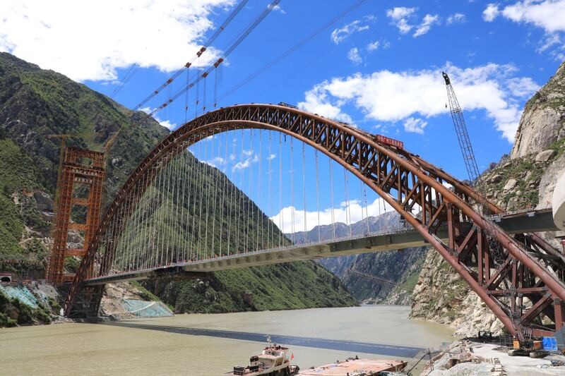 川藏铁路的重要组成部分——拉林铁路于2015年6月开工建设。中铁广州局承建了川藏铁路拉林段三座跨雅鲁藏布江大桥的建设,即贡嘎雅鲁藏布江特大桥、藏木鲁藏布江特大桥、绒乡鲁藏布江特大桥,为“新天路”的修建再立丰碑。其中,藏木雅鲁藏布江特大桥是世界海拔最高、跨度最大的中承式铁路拱桥,该桥是拉林铁路全线重点控制性工程,是中国首座一跨过雅鲁藏布江的桥梁,全长525.3米,主跨为430米中承式钢管混凝土拱,地处海拔3350米的高山峡谷之间,施工难度极大。主拱钢管采用变直径耐候钢钢管,为国内首次采用。贡嘎雅鲁藏布江特大桥是西藏跨越雅鲁藏布江最长的铁路桥,大桥全长5726米,上部结构由32米简支T梁和48米简支节段箱梁构成,共有132个墩台。节段箱梁采取“长线法”预制成型,采用胶接法拼装工艺,在国内属于首创。