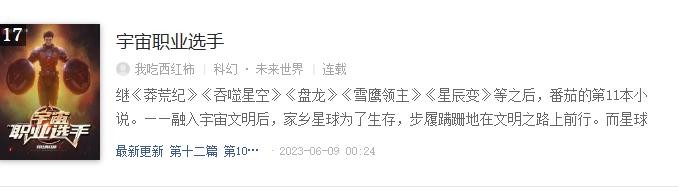 起点中文白金作家我吃西红柿的《宇宙职业选手》是他的第11本小说,也是继《莽荒纪》《吞噬星空》《盘龙》《雪鹰领主》《星辰变》等之后的作品,是一部未来科幻小说。