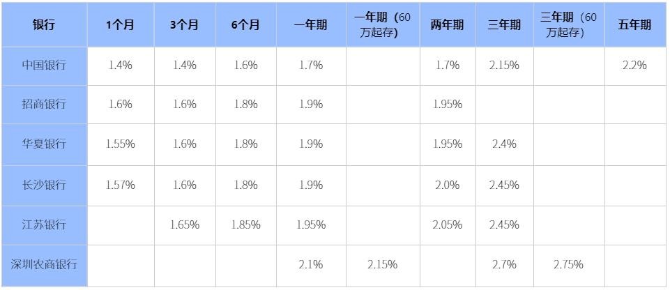 1、中国银行:一个月利率1.4%、三个月利率1.4%、六个月利率1.6%、一年期利率1.7%、两年期利率1.7%、三年期利率2.15%、五年期利率2.2%。