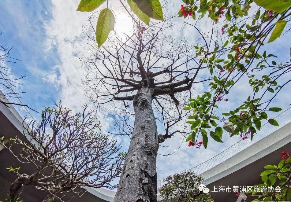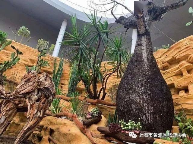 沙谷绿洲展区,呈现了400多个品种的热带沙生植物,包括有沙漠玫瑰、武轮柱、金琥、马达加斯加龙、油橄榄、猴面包树、酒瓶兰、霸王鞭、非洲霸王树、昆士兰瓶树、象腿树等。而这里有另一棵西馆镇馆之宝:大腹木棉,来自福建,胸径达到了1.6米,高5-5.5米,目测需2-3人才可环抱围住,亦是该树种在上海最大的一棵。