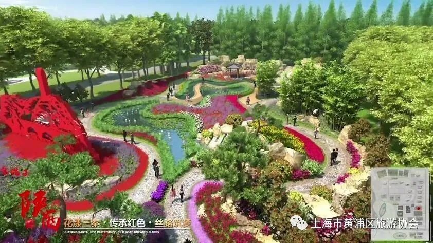 陕西园:占地面积3000平方米,主题“传承红色,花漾三秦”。展园将延安的宝塔山,用“剪纸”艺术结合锈版来打造成园区的景观亮点;用红色洗米石制成栈道来体现古丝绸之路起点;以秦岭的地貌特征作为整个园区的收边,采用秦岭特有的千层石配以优美花境,来体现陕西悠久的历史和优美的生态环境。
