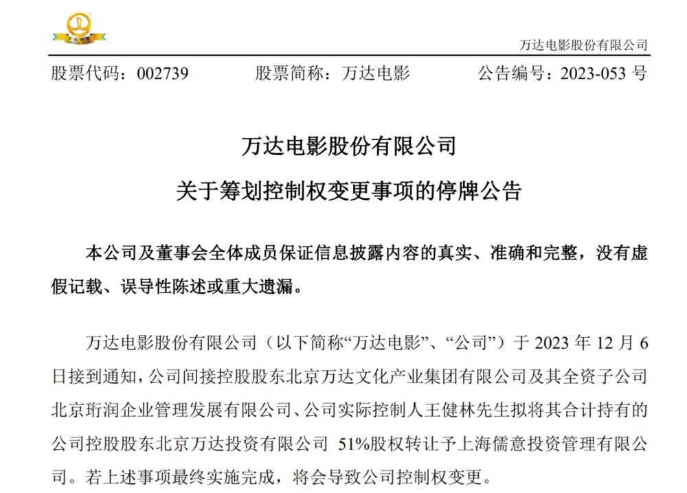 12 月 6 日,万达电影发布公告称,公司实控人王健林及相关公司,拟将其合计持有的公司控股股东万达投资 51% 的股权转让给上海儒意投资管理有限公司。