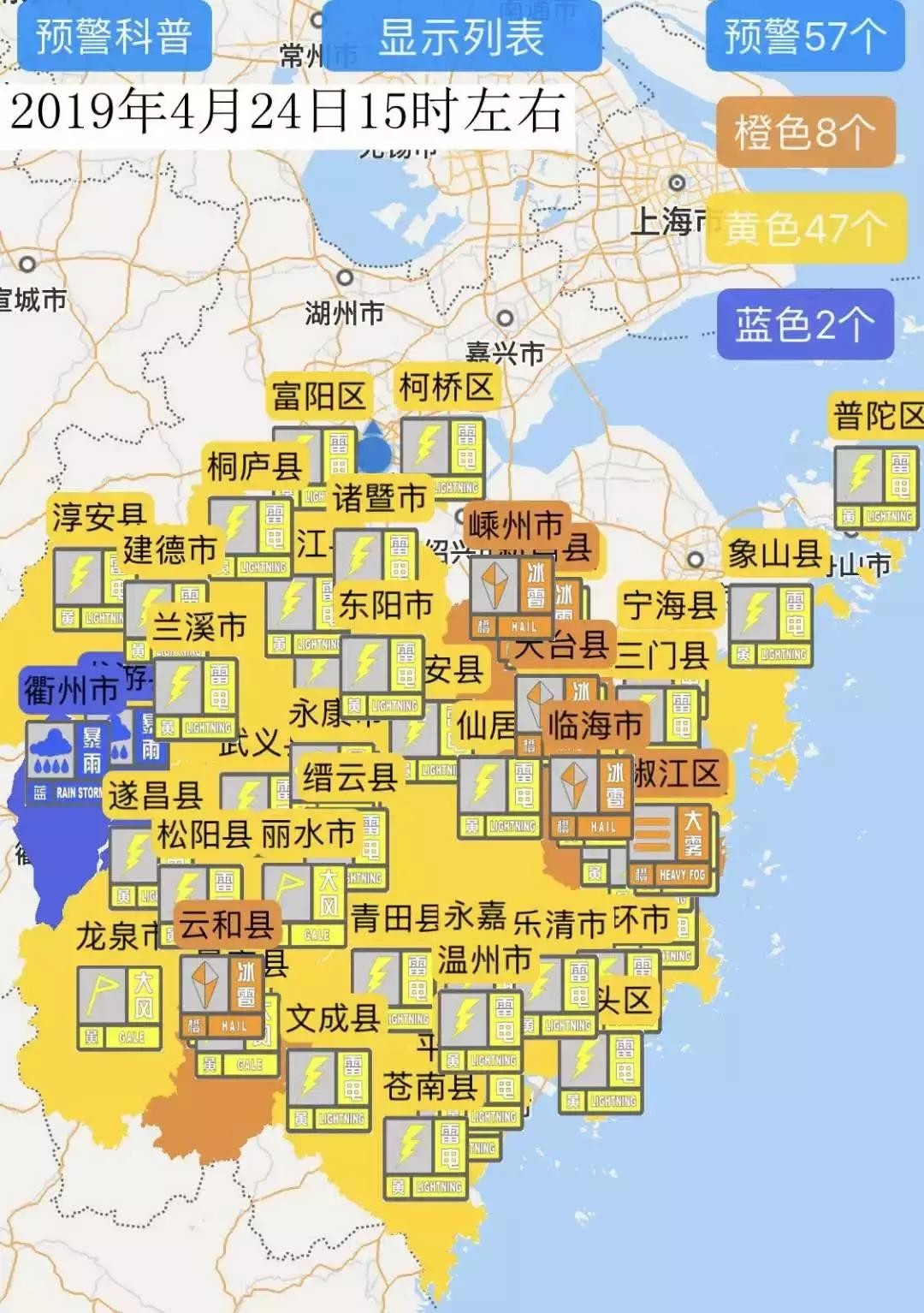 2019年04月24日14时38分,温州市气象台发布温州市区雷电黄色预警信号。