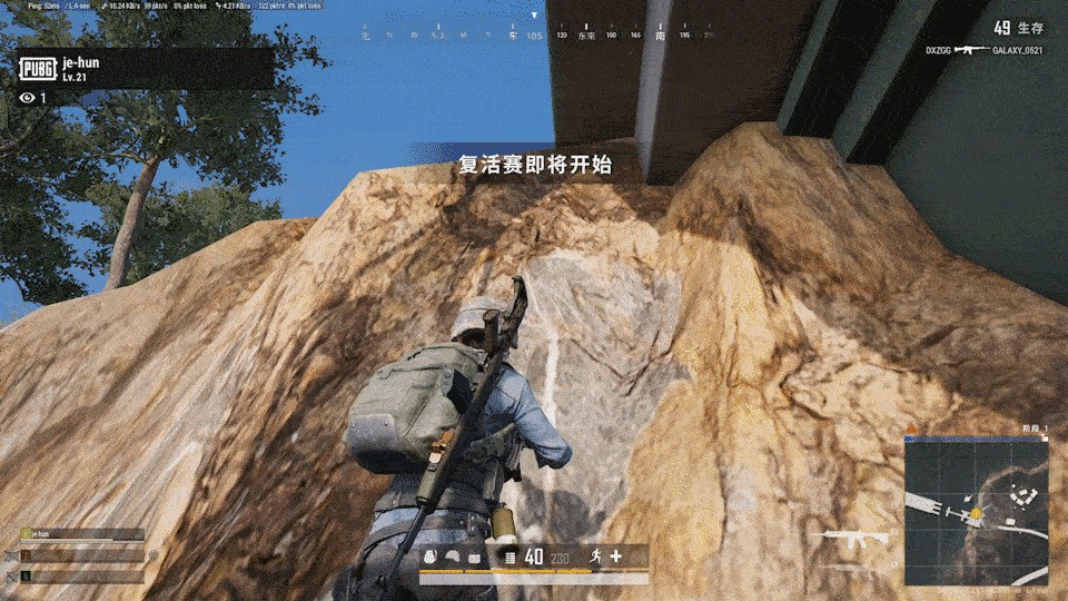 第二个蓝圈出现的同时,被淘汰的玩家会被传送到地图东南角的复活赛专属小岛上。复活赛和常规赛的玩法一样——收集物资,武装自己,坚持到最后。只不过玩家无需淘汰所有敌人,只要坚持至倒计时结束即可。复活赛结束后,玩家会携带所有拾取的道具以及战绩乘坐直升机返回赛场。最后要注意一点,复活赛所在的小岛面积不大,往往可用的面积只略大于艾伦格的学区房,所以如果前期有较多玩家被淘汰的话,复活赛将异常激烈。
