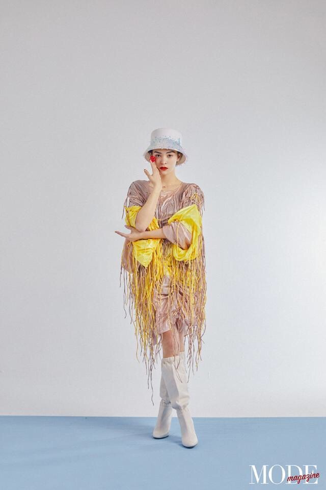 这身的穿搭就看点十足了!戴上了一顶白色渔夫帽,这顶帽子作用可不少,不仅有修饰的作用,还可以把脸显得特别小,在穿搭上是一款拼接式流苏裙,紫宇色与亮黄碰撞,丝毫没有违和感,穿搭一双白色长靴,气质爆棚!