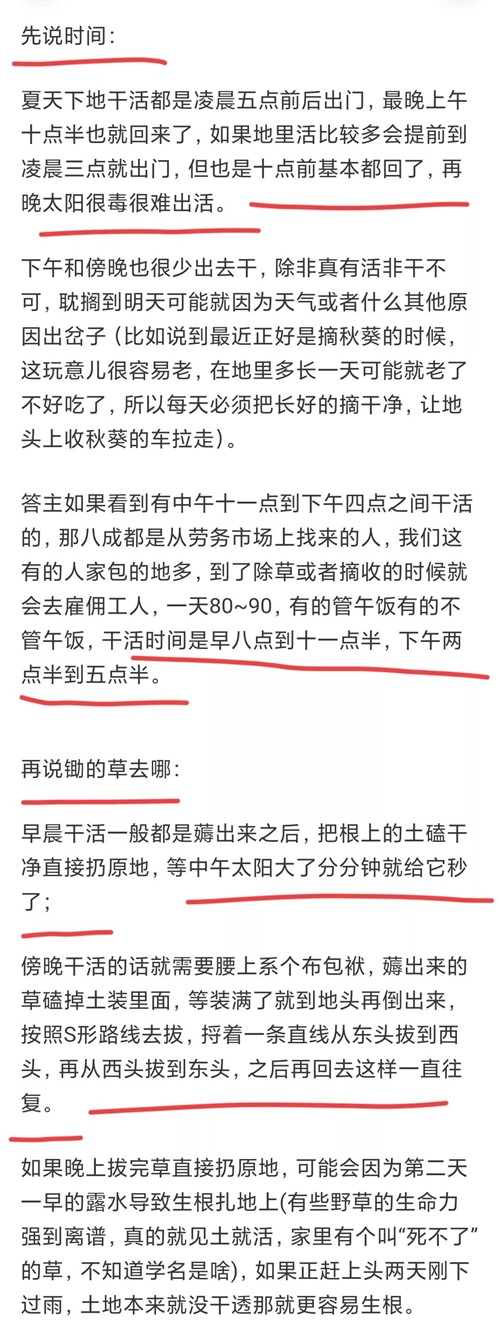 最热的时候,作物生长最快,同样杂草也是长得最快的时候,除完草隔一周10天再去看,就又满地都是。而且杂草比作物生长速度要快一截,会大量抢走营养成分,导致减产。没办法,不想减产就得勤快些。这事有个“专有”名词叫做:田间管理。另外,除草虽然是在“最热”的季节,但不是非要中午去,早上并不怎么热。