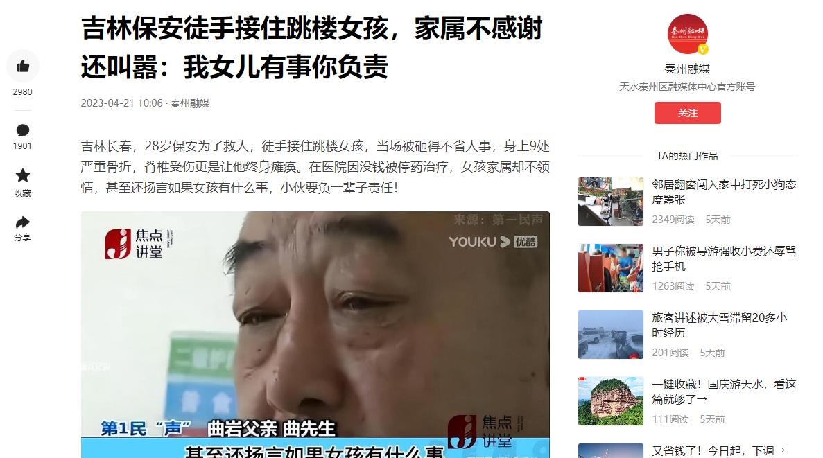 吉林保安徒手接住跳楼女孩,家属不感谢还叫嚣:我女儿有事你负责 [泰州融媒]