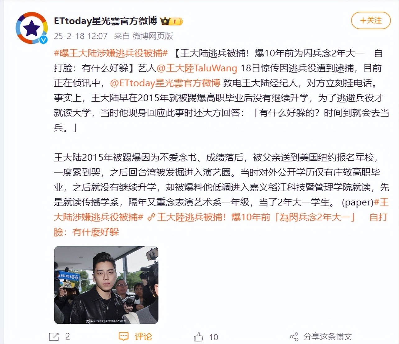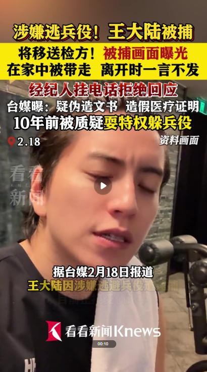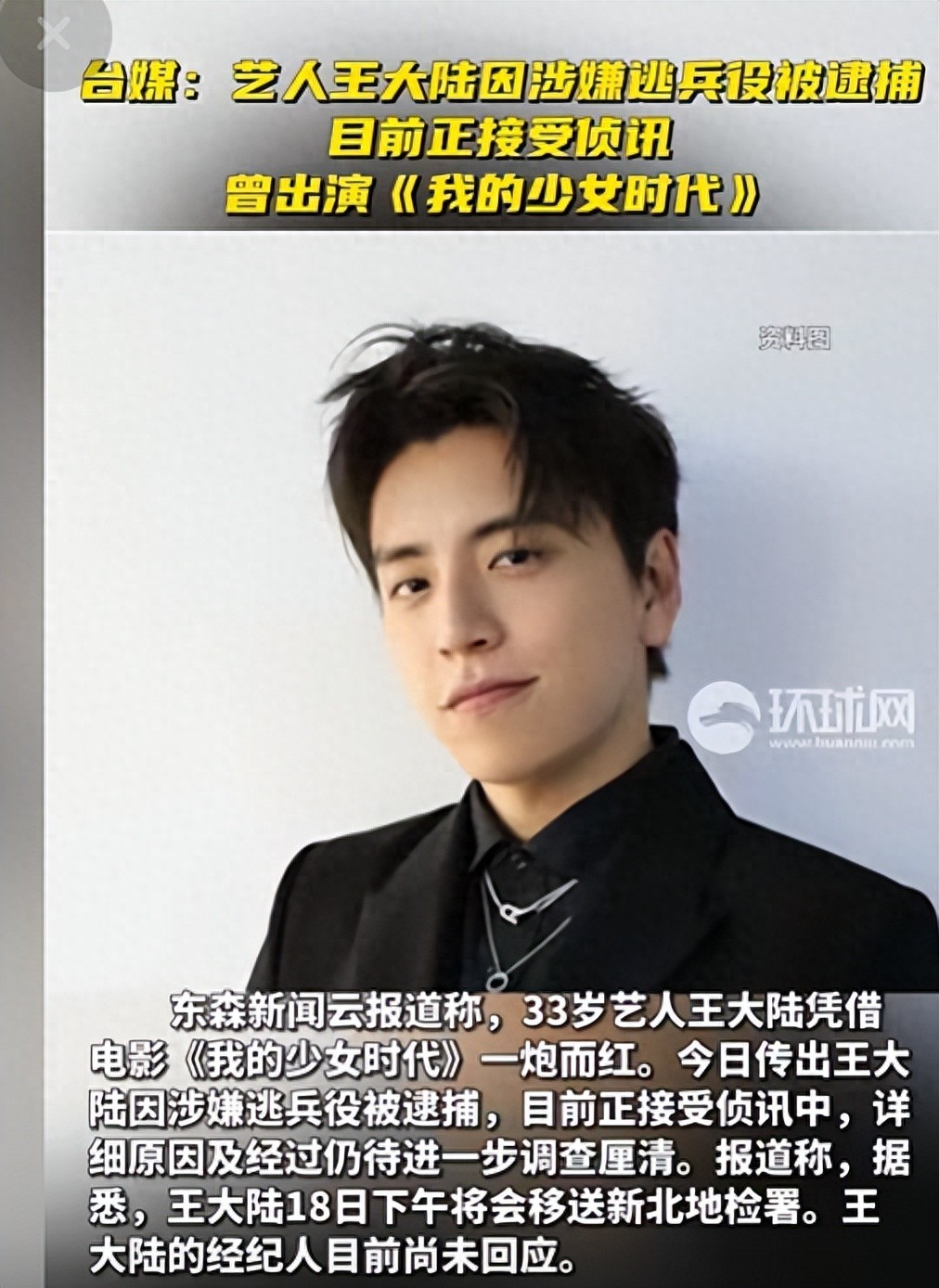 根据台湾省媒体报道,知名艺人王大陆因涉嫌逃兵役被逮捕目前正在接受审讯。