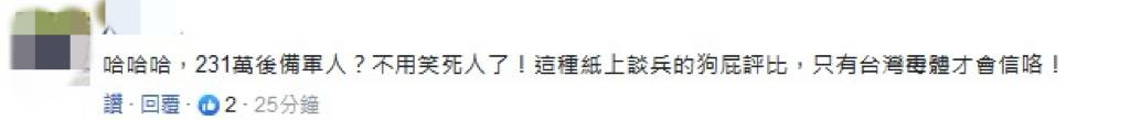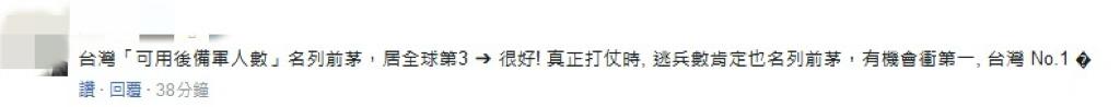 而对于这个排名,岛内有网友评论说," 真正打仗时,逃兵数肯定也名列前茅 "。