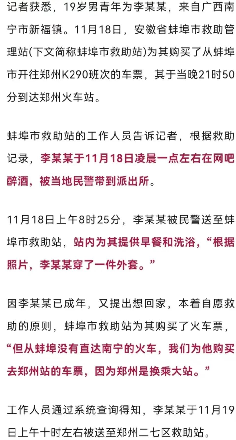 郑州相关职能部门工作人员告诉记者,网传信息与实情不符,该 19 岁青年于 11 月 18 日晚乘火车由蚌埠抵达郑州,19 日下午搭乘火车离开郑州," 并非网传 4 天未吃喝。"