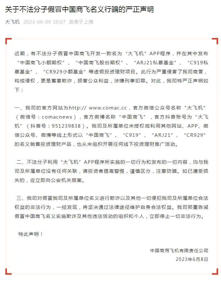 另据 " 大飞机 " 微信公众号 6 月 9 日发布的《关于不法分子假冒中国商飞名义行骗的严正声明》,有不法分子假冒中国商飞开发一款名为 " 大飞机 "APP 程序,并在其中发布 " 中国商飞小额期权 "、" 中国商飞股份期权 "、"ARJ21 私募基金 "、"C919 私募基金 "、"CR929 小额基金 " 等虚假投资理财项目。