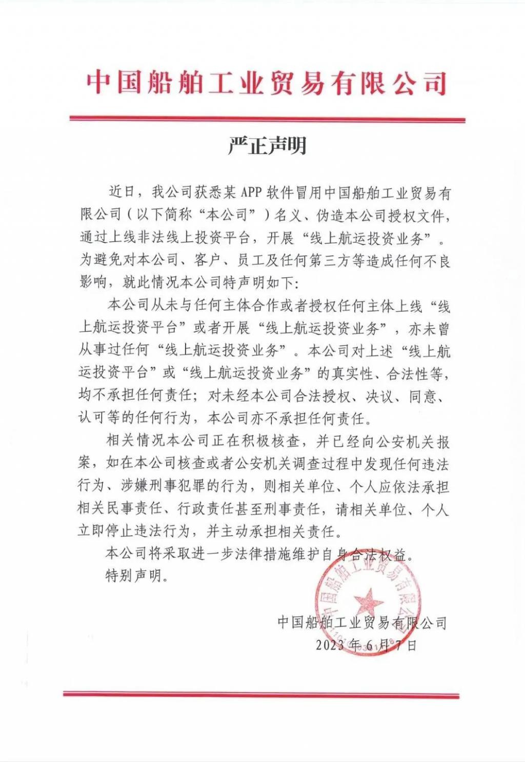 " 中国船舶工业贸易有限公司 " 微信公众号近日发布声明称,近日,公司获悉某 APP 软件冒用中国船舶工业贸易有限公司名义、伪造本公司授权文件,通过上线非法线上投资平台,开展 " 线上航运投资业务 "。