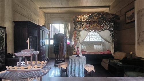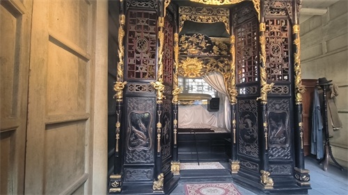 刘文彩夫妻的卧床各是贴金的游龙飞凤。隔着窗户玻璃看刘文彩的龙床,占地九平米,方方正正,甚是高大,不过总感觉差点气派,看着像个牢笼。