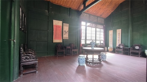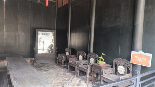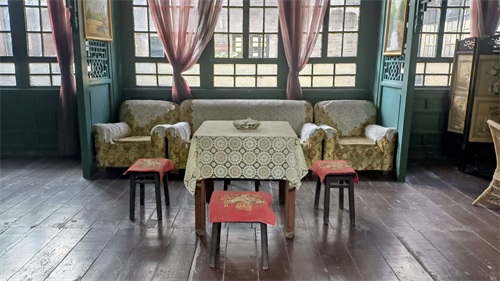 刘文彩庄园大门是一个长走廊,左边是管家住房等的院墙,右边是没有门窗的中、西式会客厅。会客厅的椅子有点特色,这种宽大的椅子不是川西这边的家具风格,反倒是很像是按照其镇宅之宝——一套清代的椅子仿制的,这样的椅几在其宅内到处可见。