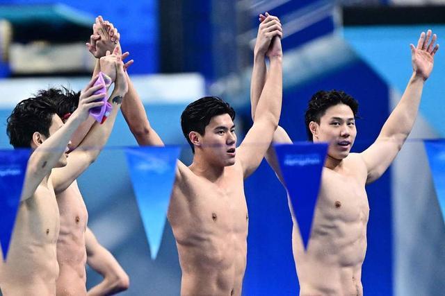 杭州亚运会男子 4x100 米混合泳接力决赛,中国队破亚洲纪录夺冠。徐嘉余、覃海洋、王长浩、潘展乐在庆祝胜利。