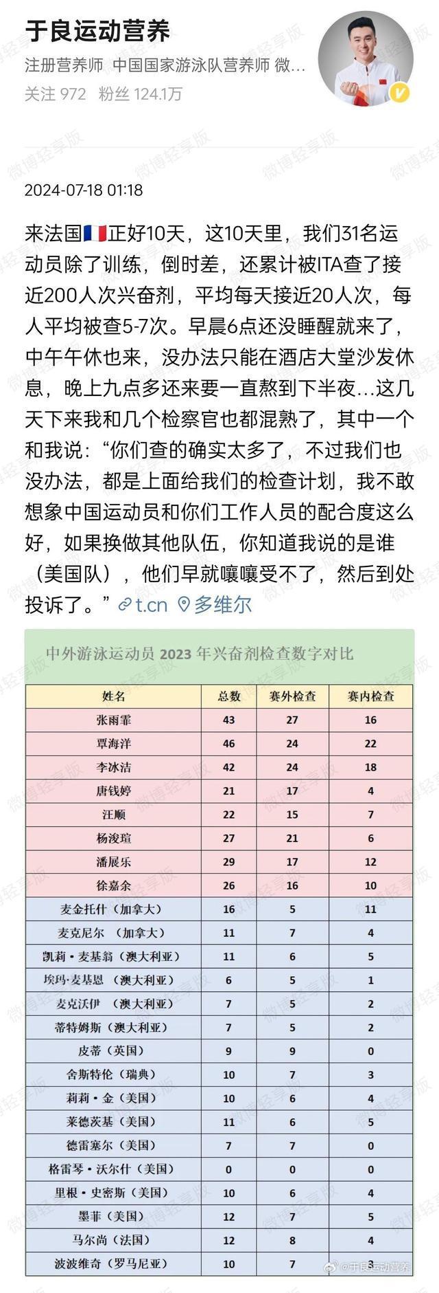 北京时间 7 月 18 日,据中国游泳国家队营养师于良发文表示,中国游泳队前往法国 10 天,全队 31 名运动员被国际兴奋剂检测组织(ITA)查了近 200 次。