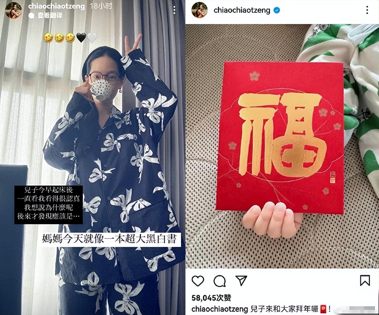 还配文:儿子一直看我,想想应该是自己穿了超大的黑白睡衣的原因,两人儿子生下来并没有公开照,而是小手拿着一张福字给大家拜年,从小手可以看出皮肤白而且手指纤长,应该有六七斤的样子。