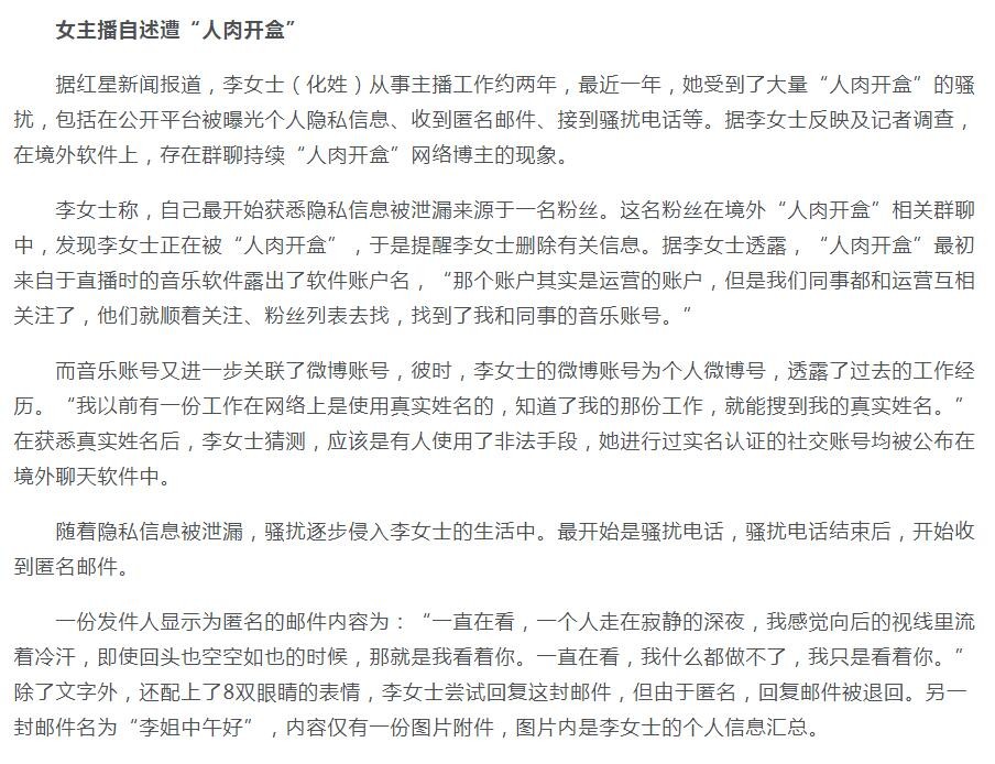 而且曝光这些信息的背后有一个群体,并不是个人。这些群体会在各个平台公开明星、主播、网红等主个人信息,并且还会进行一系列电话私信骚扰、网暴攻击、不实恶意举报等违法行为。