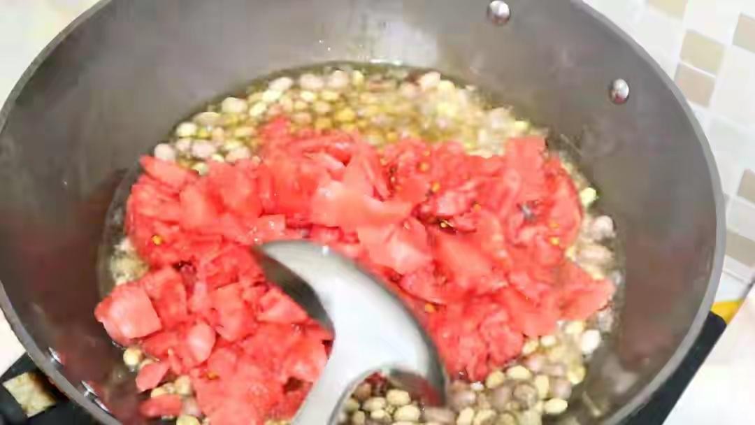 热锅加入适量的宽油,放入所有大料炸出香味。炸好后,将大料捞出不用。然后,加入煮好的花生和黄豆,以及西瓜。用中火熬制30分钟左右。