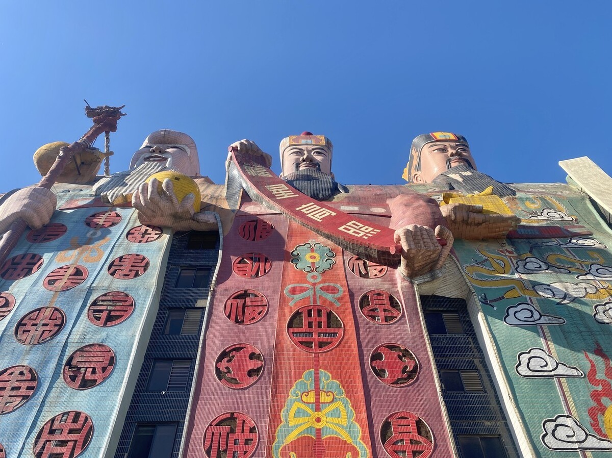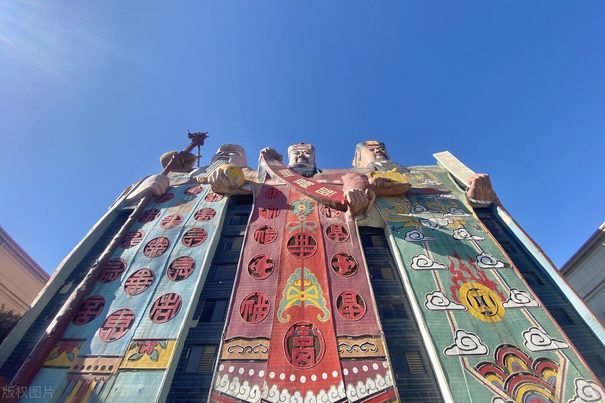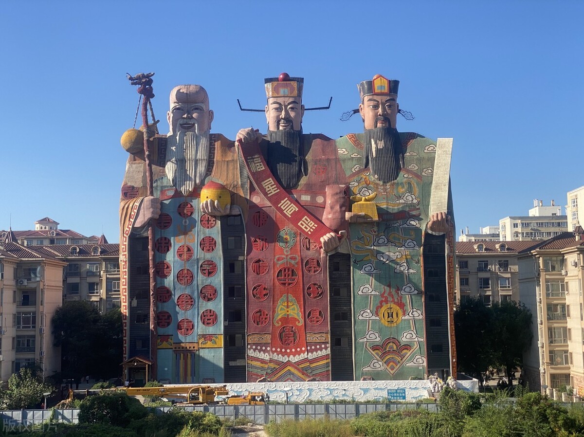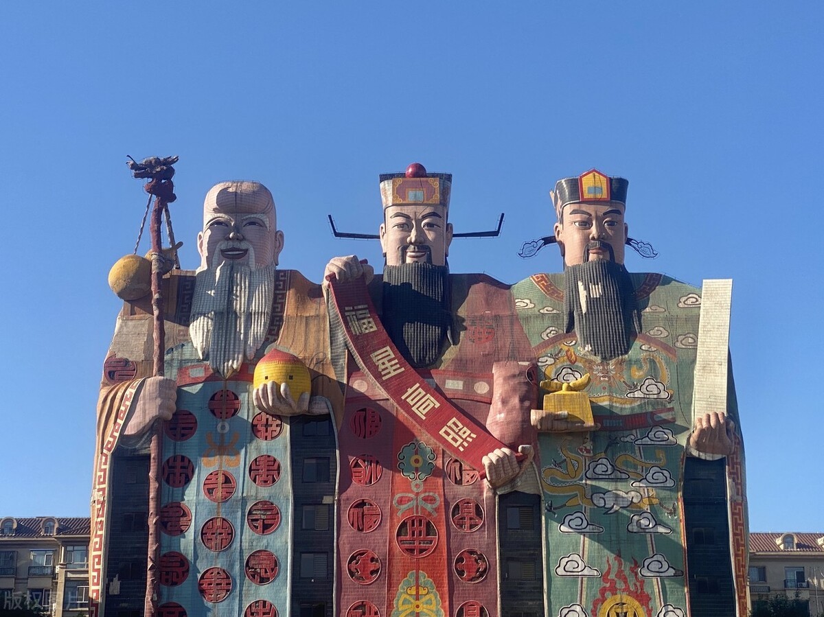 2023年9月12日,河北三河,天子大酒店的“福禄寿”三星彩塑。天子大酒店是位于河北省三河市的一家酒店,酒店外形为传统“福禄寿”三星彩塑,曾以“最大象形建筑”登上了世界吉尼斯纪录并获吉尼斯最佳项日奖