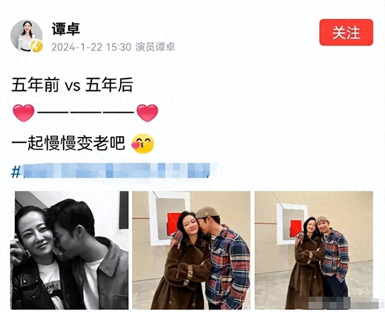 谭卓在自己的社交账号公布了自己的恋情后,她还特意把自己和男友章宇的亲密照片放了上去,随后还配文道:“五年前vs五年后,一起慢慢变老吧。”
