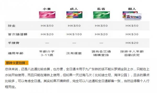 1. 可办理八达通卡(八达通分小童、成人和长者三种,对于小童和长者卡乘车有优惠,可无期限使用、可搭乘香港各种交通工具、可购物),无需预订,可到港购买(港铁、机场、金钟巴士总站和中环码头以及离岛的长洲码头、都有八达通的销售点),初次购买150港币/张(50港币押金,100港币可用);