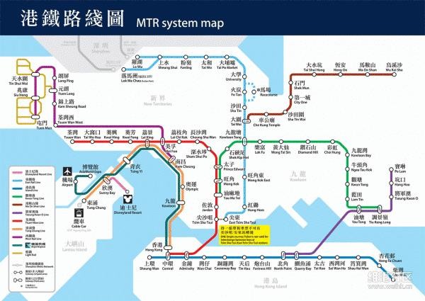 香港轨道交通共分9条大线路:港岛线、荃湾线、观塘线、将军澳线、迪士尼线、东涌线、东铁线、西铁线、马鞍山线。