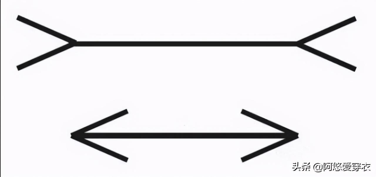 姐妹们看上面两条线,谁看起来更短一些呢?是不是下面那条呢?其实人家两条线都一样长啦!只是因为下面那条线向中间收紧,所以视觉上更显瘦一些。直筒裤显瘦也是因为这个道理。