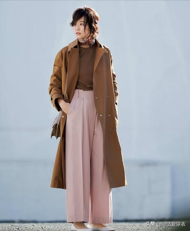 这套日系风满满的穿搭就选择了用万能的阔腿裤进行搭配。焦糖色翻领大衣内搭棕色毛衣,上装同色系搭配很显瘦。用精致的丝巾系在脖子上,增加整体的精致度。