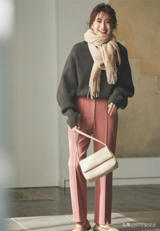2.毛衣搭配直筒裤,上深下浅的配色方式更显高