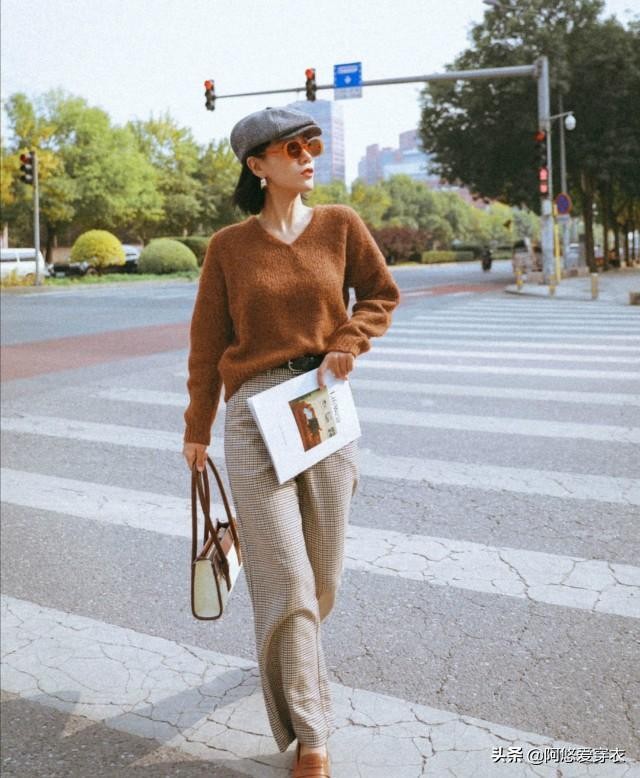 棕色系毛衣叠穿白衬衫,清爽干净又有层次感。搭配一条灰色的毛呢直筒裤,胯宽、腿粗等问题都可以得到轻松解决。