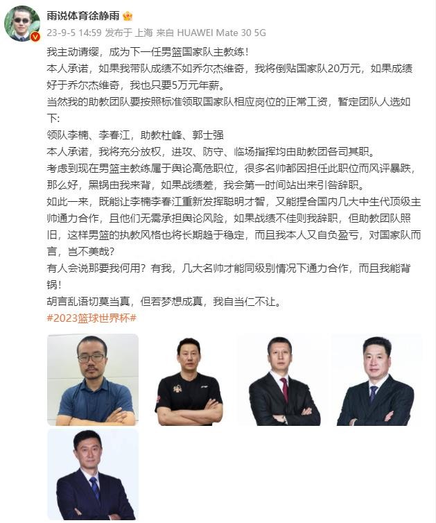 9月5日,篮球评论员徐静雨在社交媒体上宣布,他愿意担任中国男篮国家队的主教练。他承诺,如果他的带队成绩不如现任主帅乔尔杰维奇,他将向国家队支付20万元,如果成绩更好,他只需要5万元年薪。徐静雨的助教团队将按照标准领取国家队相应岗位的工资。