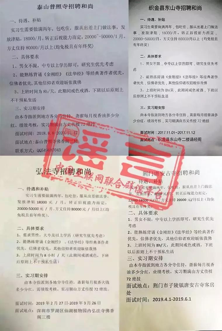 记者查证发现,近年来,网上不时会出现此类“招聘和尚尼姑”的虚假信息,涉及广东弘法寺、浙江灵隐寺等诸多寺院。通过对比这些虚假招聘信息,不难发现其内容换汤不换药,无论是薪资待遇还是工作要求都高度相似,只有招聘的寺院名称和面试时间地点不同。