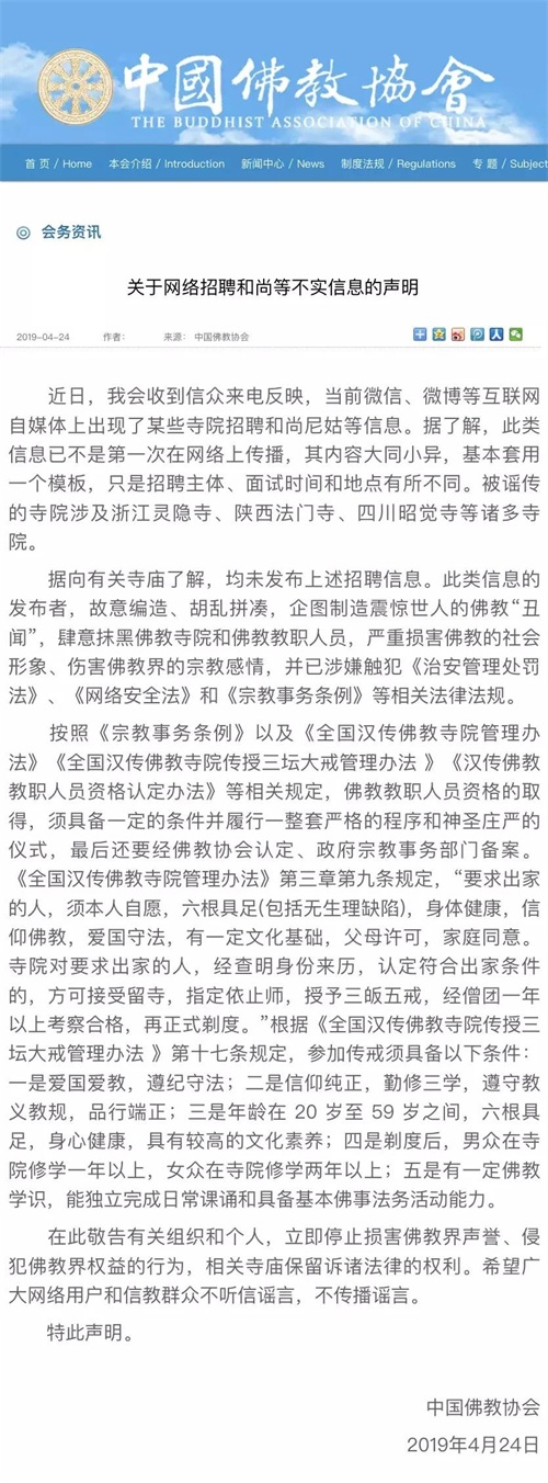 中国佛教协会发布声明称,上述寺院均未发布过这些招聘信息。此举已涉嫌触犯《中华人民共和国治安管理处罚法》《中华人民共和国网络安全法》和《宗教事务条例》等相关法律法规。希望广大网络用户和信教群众不听信谣言,更不传播谣言。