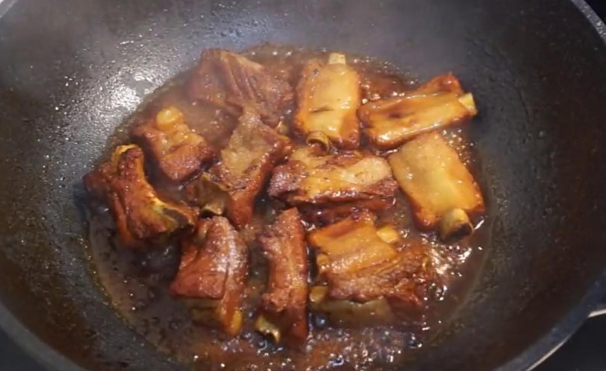 3,放入排骨翻炒一会倒入开水,放入葱姜蒜调料,和调好的料汁。放入一勺盐 一勺香醋,接着大火收汁