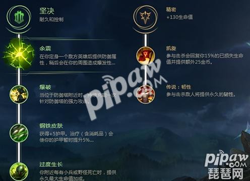 说明:坚决基石符文选择余震和爆破,还有钢铁皮肤和过度生长,可以提高生存能力;精密基石符文选择凯旋和韧性。