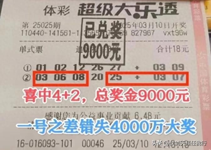 在大乐透第25025期开奖后,一位广东彩民的经历成为了众人热议的焦点。这位彩民花费18元,选择了一张2注号码、3倍投的单式追加票,最终收获了9000元奖金。然而,原本有可能到手的是高达4000万元的一等奖,只因前区一个号码的差错,与巨额奖金失之交臂。