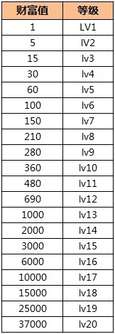 20级需要3万5财富值才能达到,其他等级后期补充