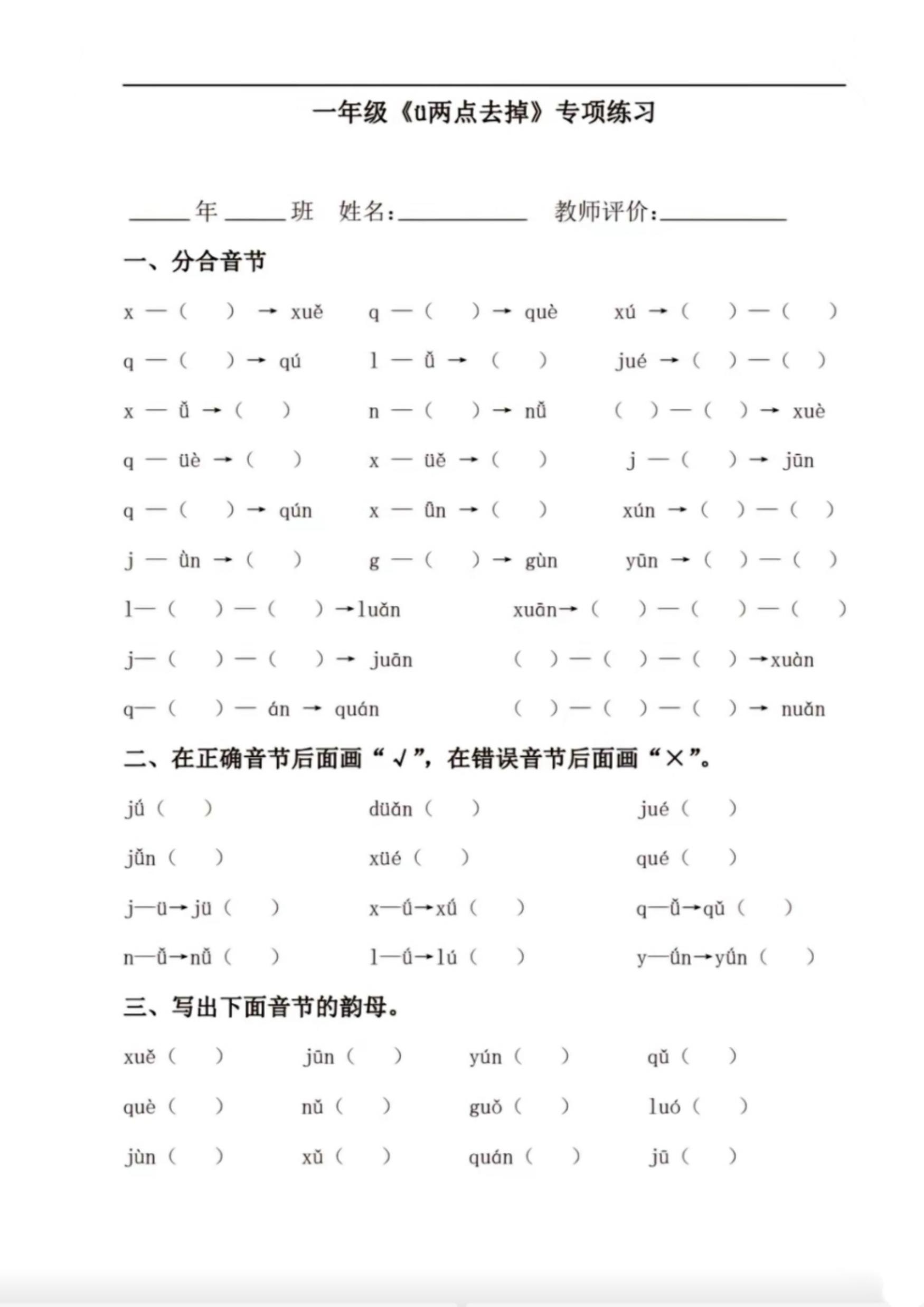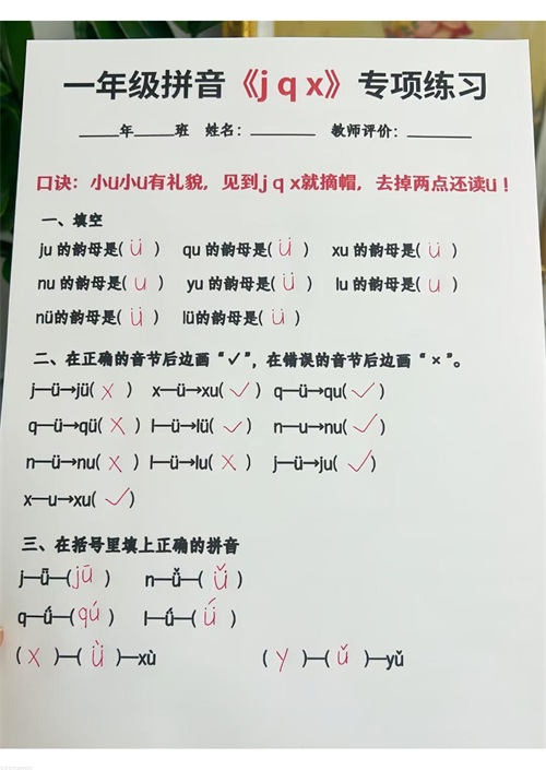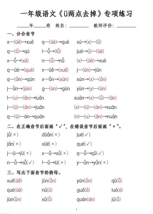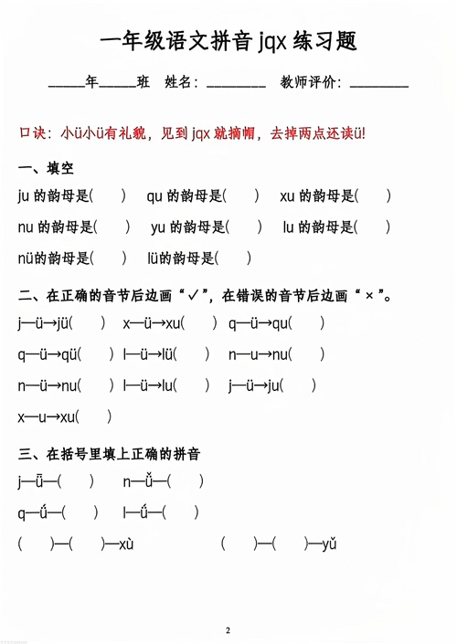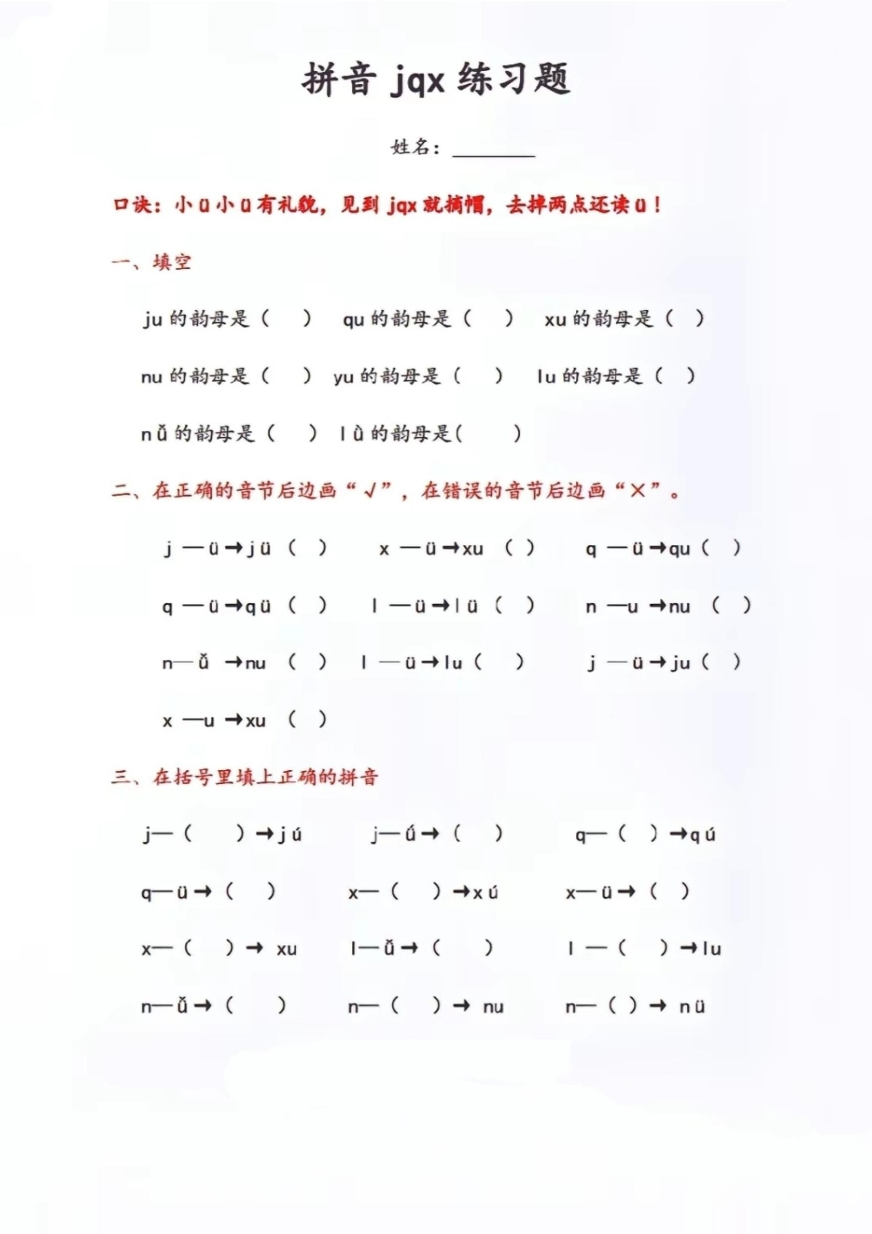一上语文jqx和ü相拼(ü去点两点)方法口诀及专项练习,共3套