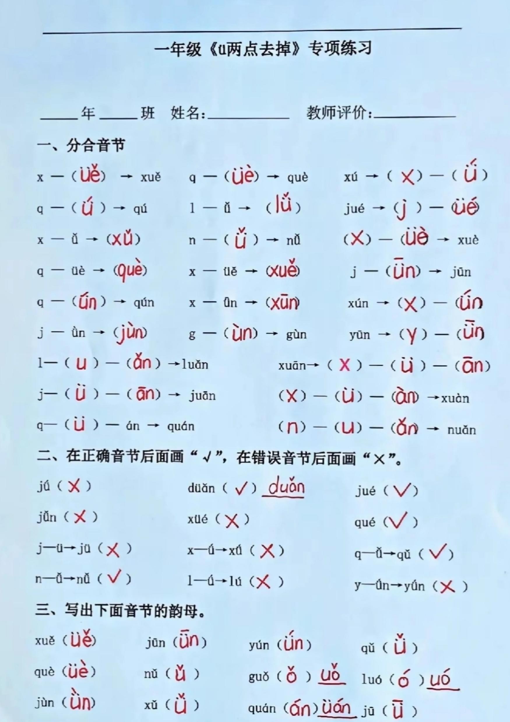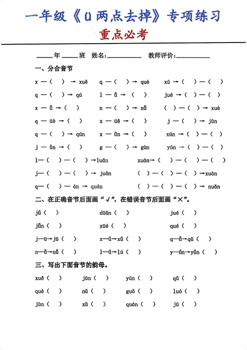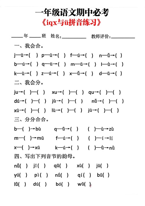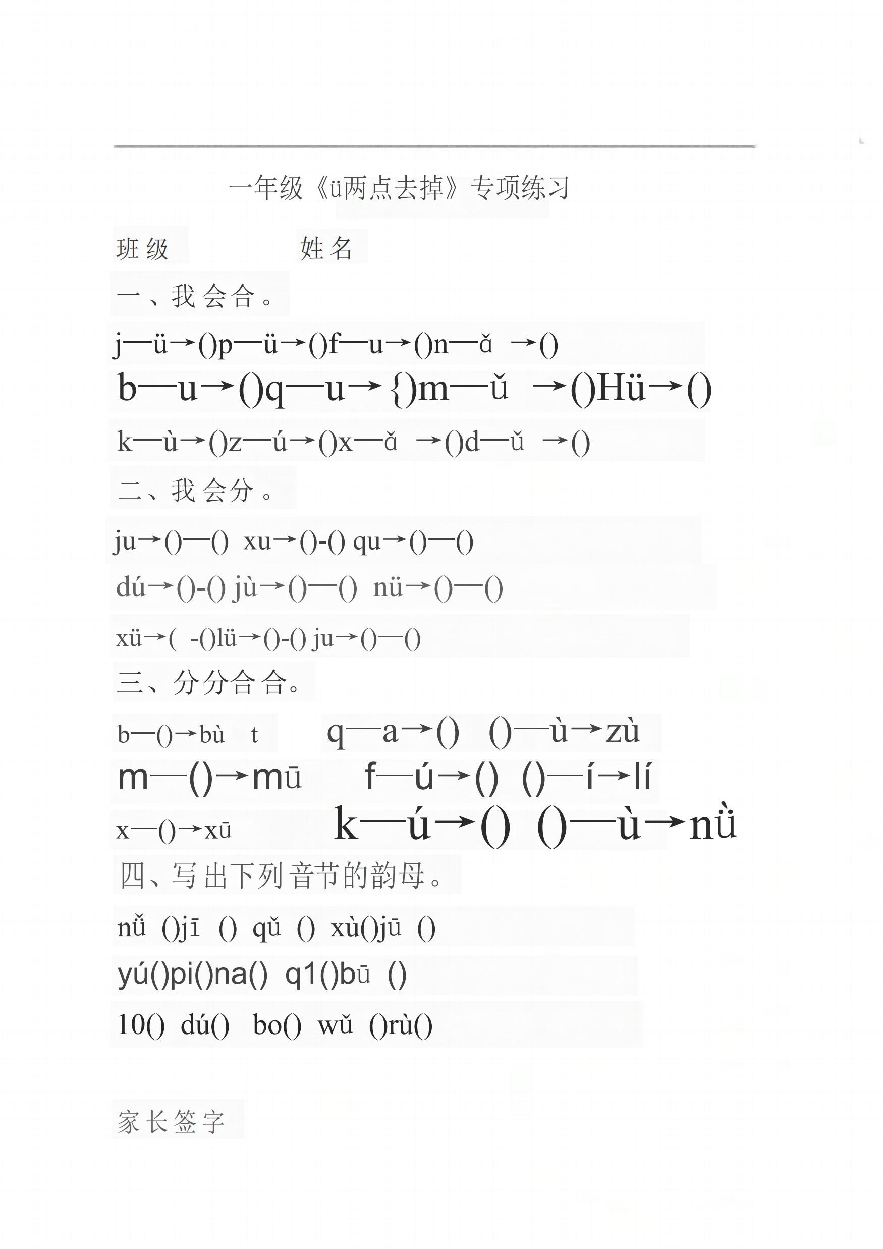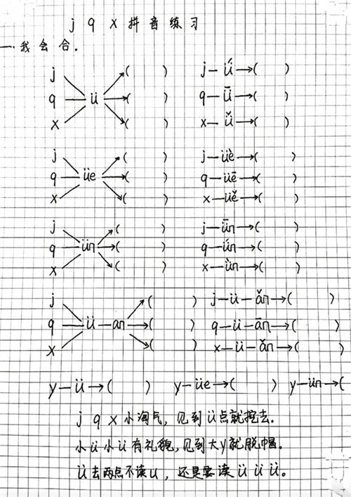 一上语文jqx和ü相拼(ü去点两点)方法口诀及专项练习,共3套