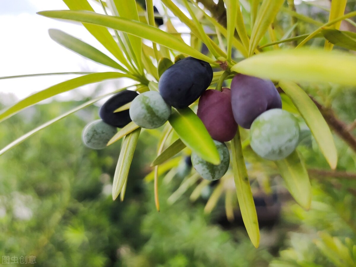 识别特征:常绿大乔木,树皮灰白色,纵浅裂,呈薄鳞片状脱落;叶革质、全缘、条披针形,叶端尖,两面中脉显著隆起,表面暗绿,背面灰绿色,有时被白粉;雌雄异株或偶有同株的情况,种子卵形,生于肉质膨大的种托上,种托熟时深红色,味甜可食,似罗汉披袈裟。花期5月,种子成熟10月。
